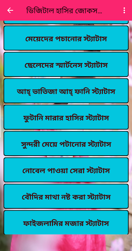 আপনাকে আর কষ্ট করে হাসির জোকস স্ট্যাটাস খুজতে হবে না এই অ্যাপসটিতে আছে অনেক অনেক হাসির জোকস স্ট্যাটাস।