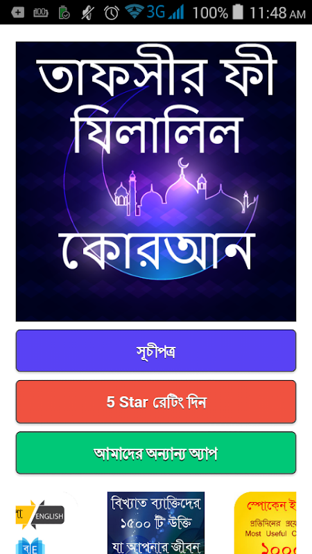 Quran sharif is one pillar of islam. So, we should read Al Quran with bangla meaning (al quran with bangla translation). Quran majeed is source of guidance. One can get the correct knowledge of Islam from reading kuran 30 para bangla (al quran with bangla tafsir) from a al quran bangla uccharon book. This app contains famous tafseer jilalil quran in bangla complete 22 parts. Among all tafsir al quran bangla this is one of the authentic tafseer in the history of Islam besides tafsir maariful quran bangla, tafhimul quran, tafsir jalalain bangla etc.