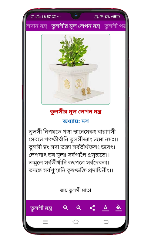 তুলসী মন্ত্র Tulsi Mantra Puja - অ্যাপটিতে নিম্নলিখিত বিষয়গুলি রয়েছে।