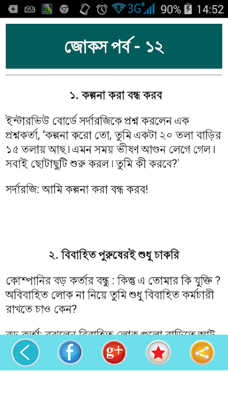 আমাদের এই bangla jokes app টিতে রয়েছে সোশ্যাল শেয়ারিং অপশন এতে করে আপনি এইসব মজার মজার কৌতুক ও হাসির বক্স গুলোকে ফেসবুক স্ট্যাটাস (facebook status )হিসাবে শেয়ার করতে পারবেন আপনাদের বন্ধুদের সাথে ।