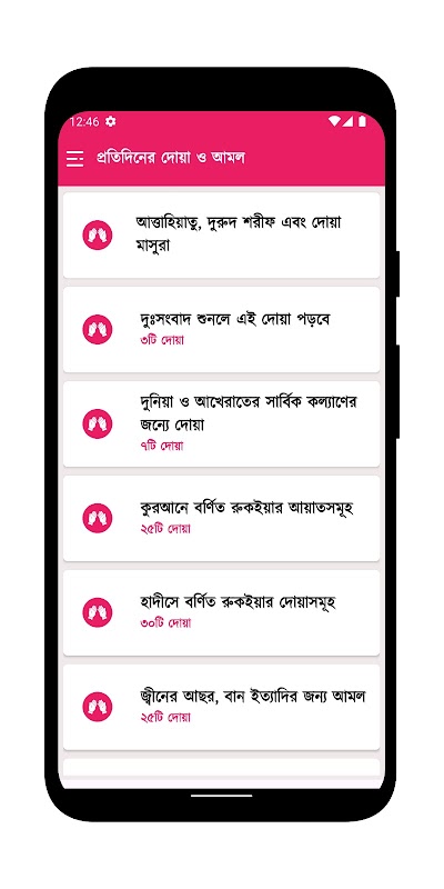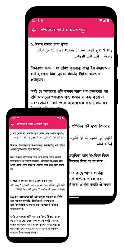 दैनिक आवश्यक दुआओं को बंगाली उच्चारण और बंगाली अर्थ के साथ अरबी के साथ व्यवस्थित किया गया। इस ऐप में सुबह और शाम की प्रार्थनाएं और कर्म शामिल हैं। अल्लाह से मार्गदर्शन पाने के लिए दुआ, दुनिया और उसके बाद के समग्र कल्याण के लिए दुआ, माता-पिता और बच्चों के लिए दुआ, खतरे, विपत्ति और कमी से बचने के लिए दुआ, बीमारियों और मानसिक समस्याओं से राहत के लिए दुआ। शौचालय में प्रवेश करने से पहले दुआ, सोने से पहले पढ़ने की दुआ, छींक आने की दुआ, मस्जिद में प्रवेश करने की दुआ। कुरान में वर्णित रुकिया की आयतें और हदीस में वर्णित रुकिया की दुआएं, प्रार्थना के दौरान पढ़ी जाने वाली दुआ और प्रार्थना के बाद पढ़ी जाने वाली दुआएं भी हैं। सैय्यदुल इस्तिग़फ़र, दरूद शरीफ़, कलीमा, कुनुते नजेला, मुनाजते मकबूल सहित सभी आवश्यक दुआएँ जिन्हें हमारे दैनिक जीवन में याद किया जाना चाहिए और नियमित रूप से पढ़ा जाना चाहिए।