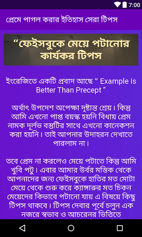 সুন্দরি মেয়েদের পটাতে এবং মেয়েদের প্রেমের ফাদে ফেলতে হলে আপনাকে অবশ্য মেয়ে পটানোর টিপস গুলো যানতে হবে। আর তাই মেয়ে পটানোর সহজ উপায় গুলো নিয়েই এই অ্যাপ।