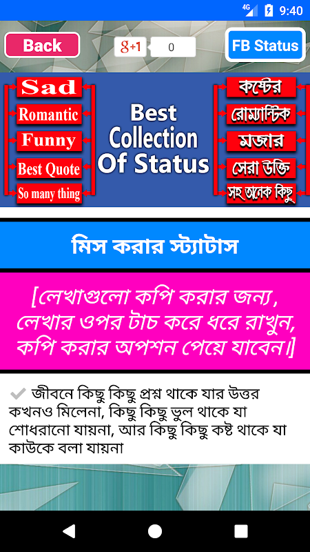 এপটির মাধ্যমে আপনি আপনার পছন্দ মত বাংলা ফেসবুক স্ট্যাটাস ও ইংলিশ ফেসবুক স্ট্যাটাস সংগ্রহ করতে পারবেন খুব সহজে।