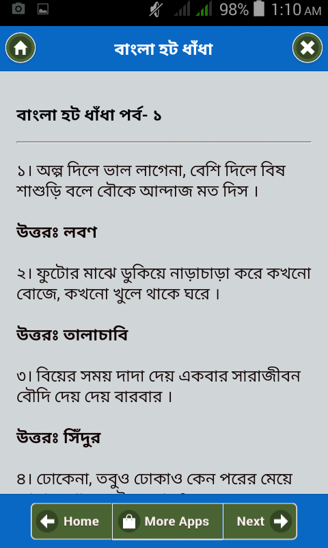 সময়ের এবং বয়সের সাথে মানুষের ভালোলাগার এবং পছন্দের পরিবর্তন হয়ে থাকে তাইতো এক এক বয়সের মানুষ এক এক ধরণের মজা করতে ভালোবাসে। আমাদের এই অ্যাপ এ উল্লেখিত সকল বাংলা ধাঁধাঁর ভাণ্ডার আপনাকে বাংলা বিনোদনের এক অন্য ভুবনে নিয়ে যাবে এবং এখানকার বাংলা হট ধাঁধাঁ এবং বাংলা হট জোকস আপনাকে হাঁসাবে।