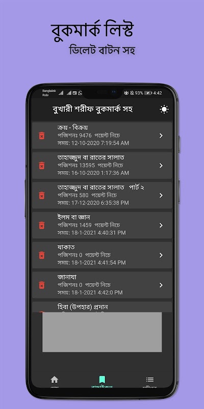 बुखारी बांग्ला फुलबुक एंड्रॉइड ऐप सर्च, बुकमार्क के साथ प्रकाश और अंधेरे मोड में।