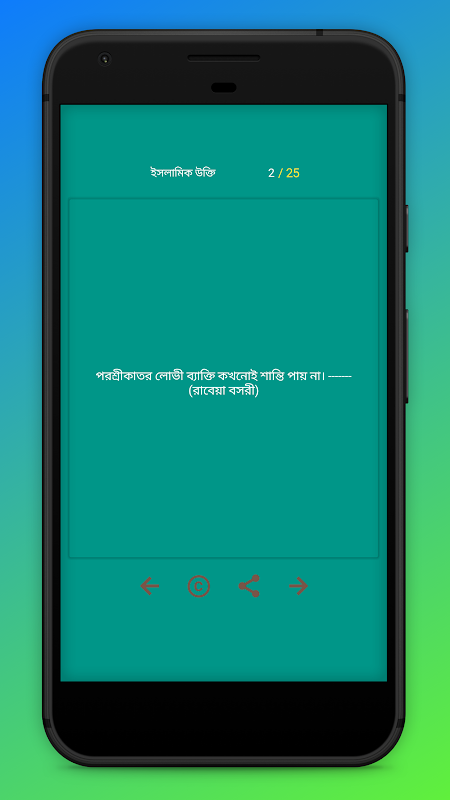 Features ……ইসলামিক উক্তি বাংলা অ্যাপ এর জগতে আমাদের এই অ্যাপটি বিশেষ ভূমিকা রাখবে আশা করছি। আমাদের এই বাংলা বানী চিরন্তনী ইসলামিক অ্যাপটি বিভিন্ন ক্যাটাগরিতে সাজানো হয়েছে যা ছোট - বড় সকলের জন্য উপযোগী । কালের আবর্তে এই ধরণীতে অনেক ইসলামিক জ্ঞানী - গুনী এসেছিলেন তাদের মরণোত্তর কালজয়ী সকল কথা ও কাজ আজ আমাদের মাঝে ইসলামিক আদর্শের রুপ ধরে বিভিন্ন ইসলামিক মনীষীদের উক্তি হিসেবে পরিচিতি লাভ করেছে। সকল মুসলিম মনিষিদের জীবনী থেকেই কিছু না কিছু উক্তি নিয়েই সাজানো হয়েছে আমাদের এই ইসলামিক মনীষীদের বাণী নামাক অ্যাপটি। আমরা আশা করছি আমাদের এই বিভিন্ন বিখ্যাত ব্যক্তিদের উক্তি নামক ইসলামিক অ্যাপটি সকলের কাছে ভালো লাগবে।মহানবীর বানী থেকে শুরু করে অসংখ্য সাহাবীদের ইসলামিক বাংলা উক্তি ও নানা মুসলিম মনিষীদের বানী নিয়ে সাজানো হয়েছে আমাদের এই অ্যাপটি।ইসলাম শান্তির ধর্ম মহানবী(সাঃ) বিভিন্ন বানি এর মাধ্যমে তার প্রকাশ করেছেন।