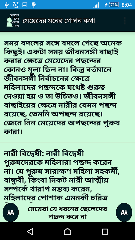 হয়তো বা। কিন্তু সে চিন্তায় আর না গিয়ে আপাতত আমরা নিয়ে এলাম সহজ সমাধান! মেয়েদের মনের গোপন কথা। কিছু সুচিন্তিত ও নির্বাচিত আর্টিকেল নিয়ে সাজানো এই এপলিকেশনটি। ছেলেদের জন্য মেয়েদের মনের কিছু অংশ অন্তত বুঝতে দারুণ কাজে লাগবে বলে আমাদের বিশ্বাস।