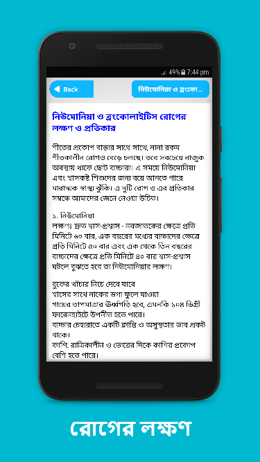 बाल रोग और उसके इलाज के लिए एक चिकित्सा अनुप्रयोग। छोटे बच्चों को कई बीमारियां होती हैं जिनके बारे में हमें जानना जरूरी है। आज हम आपसे बच्चों की विभिन्न बीमारियों के बारे में चर्चा करेंगे। अगर हमें बच्चों की बीमारी के बारे में पता नहीं होता है तो हम बच्चों को अस्पताल ले जाते हैं। ताकि आपको ऐसा न करना पड़े, मैं आपके लिए यह बांग्ला मोबाइल ऐप लेकर आया हूं।
