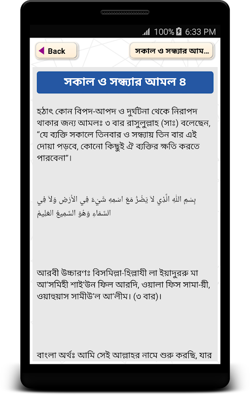 অ্যাপটি মূলত পবিত্র কোরআন ও হাদিসের আলোকে যত ধরনের সকাল সন্ধ্যার আমল রয়েছে সেসব আমলের ভাণ্ডার । উদাহরণস্বরূপ একটি দোয়ার বাংলা অর্থ নিম্নে দেওয়া হল –