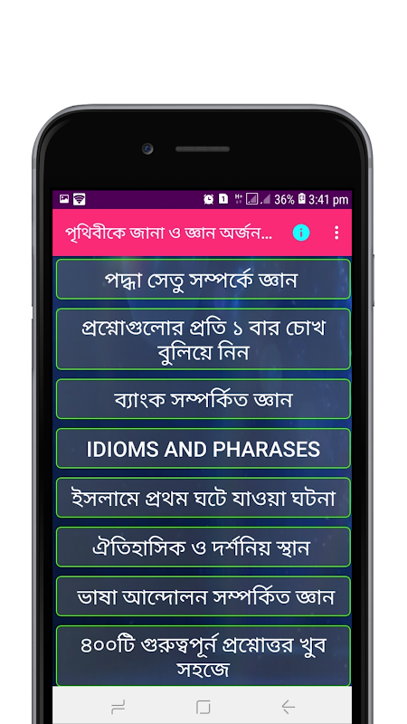 সাধারণ জ্ঞান এর প্রয়োজনীয়তা বলে শেষ করা যাবেনা। ছাত্রজীবন থেকে শুরু করে চাকরী জীবন , চাকরী জীবন থেকে শেষকাল পর্যন্ত সাধারণ জ্ঞান আমাদের প্রত্যহ কাজে দেয়। শিক্ষা এর কোনও অন্ত নেই। আর আমাদের চারপাশে যা যা ঘটনা ঘটে যাচ্ছে তা নিজেদের জেনারেল নলেজ সমৃদ্ধ করে। যে কোনও ভর্তি পরীক্ষা এমনকি চাকরীর পরীক্ষায় রয়েছে সাধারণ জ্ঞান বিষয়। তাই আমাদের এই অ্যাপটি তৈরী করা মূলত সাধারণ জ্ঞান এর ভান্ডার কে সমৃদ্ধ করার জন্য। এই অ্যাপ টি ডাউনলোড করে যেকোনও জায়গায় বসে সাধারণ জ্ঞান এর ধারনা বসে বসে পেতে পারেন। সাধারণ জ্ঞান:বাংলাদেশ ও বিশ্ব ,চাকরির জন্যে সাধারন জ্ঞান , দেশ,রাজধানী,মুদ্রা,ভাষা ও ধর্ম , বিশ্বের বৃহত্তম ও ক্ষুদ্রতম, সাধারন জ্ঞান ,সাধারণ জ্ঞান - বাংলাদেশ বিষয়ে ,ইসলামিক সাধারণ জ্ঞান ,আন্তর্জাতিক সাধারণ জ্ঞান ইত্যাদি। অ্যাপটি দ্বারা সহজে নানা বিষয় এমনকি বিজ্ঞান ও ভূগোল বিষয়ক তথ্য ও পাবেন। আশা করা যায় অ্যাপটী দ্বারা সবাই খুব উপকৃত হবেন।