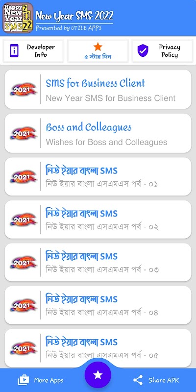 হেপি নিউ ইয়ার ২০২২ এপ্লিকেশনটির মাধ্যমে আপনি আপনার পিয়জনদের হেপি নিউ ইয়ার এসএমএস এবং হ্যাপি নিউ ইয়ার 2022 এর বাণী সহ এখান থেকে আপনি আপনার পছন্দ অনুযায়ি New year sms বেছে নিয়ে যেকোনো সামাজিক যোগাযোগ মাধ্যমে সরাসরি happy new year status পোষ্ট করতে পারবেন অথবা কপি করেও সেন্ড বা শেয়ার করতে পারবেন।