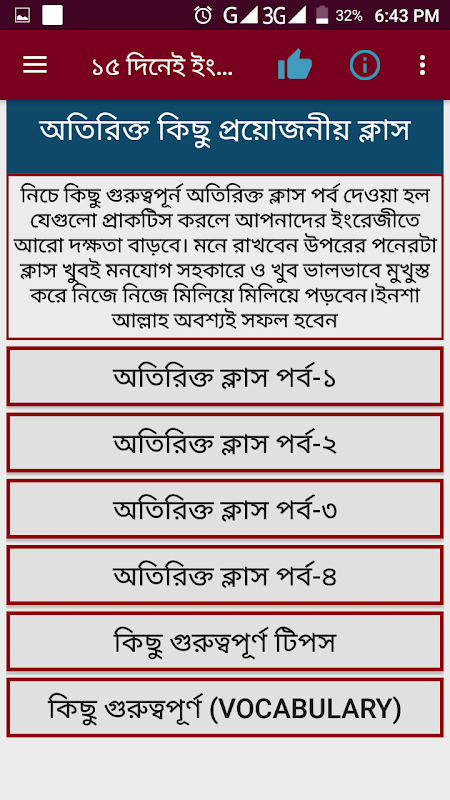 মাএ 15 দিনেই ইংরেজিতে কথা বলতে চান তাহলে প্রত্যেকটি ক্লাসে 1 দিন করে সময় দিবেন ।আর যাদের সরন শক্তি কম বা একটু বেশি দুর্বল তাদের সময় বেশি লাগবে তাই আপনারা একটু বেশি সময় দিন । টেনশনের কোন কারন নেই ক্লাস গুলো খুবই সহজ ।ক্লাস ৪-৫ এর ছাত্র হলেও পারবে।