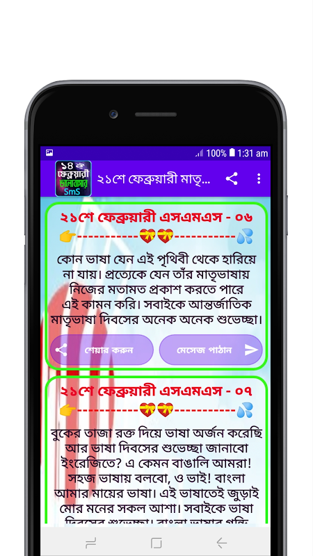 অনেকেই মাতৃভাষা দিবসের শুভেচ্ছা ছন্দ আকারে প্রিয়জনকে পাঠিয়ে থাকেন। তাদের জন্য আমরা ভিন্ন রকম আয়োজন করেছি। বিখ্যাত কবি ও সাহিত্যিকদের লেখা ভালোবাসা নিয়ে বিভিন্ন ছন্দ আমাদের এ্যাপে প্রকাশ করলাম। আশা করব এখানে প্রকাশিত প্রতিটি ছন্দ ও মাতৃভাষা দিবসের নতুন sms আপনার হৃদয় ছুয়ে যাবে। আর আপনার বয়ফেন্ড / গালফেন্ড এর পছন্দের কিছু বাংলা এসএমএস নিচে দেওয়া হল......