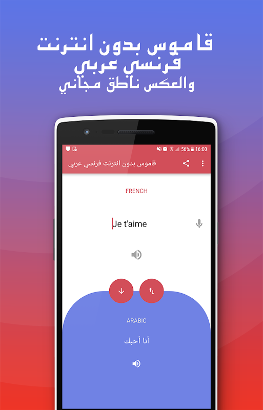 تطبيق ترجمة هو تطبيق ترجمة عربي فرنسي بدون انترنت و قاموس عربي فرنسي مترجم الكامل لجميع اللغات بدون نت يسمح لك ب ترجمة الكلمات من العربية الى الفرنسية أو العكس يتميز التطبيق بالميزات التالية :