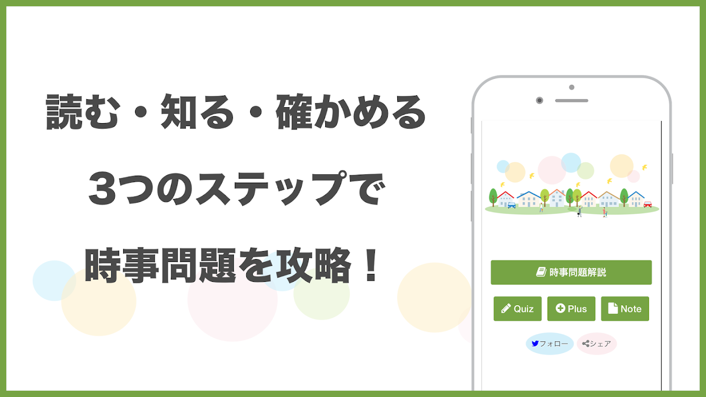 短時間で最新の時事問題や用語が勉強できる無料のアプリです。入試や就活、テストの予想問題を随時更新しています。2019年時事用語チェックリストを無料配布中です