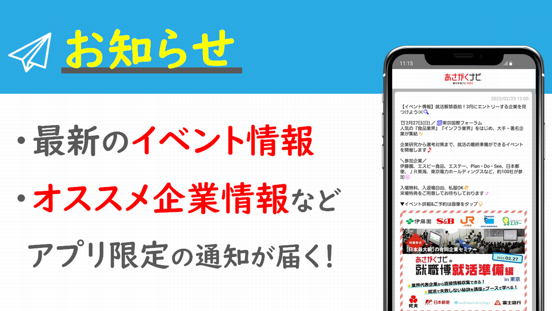 新卒向け就活・就職情報サイト「あさがくナビ2023」の公式アプリです。