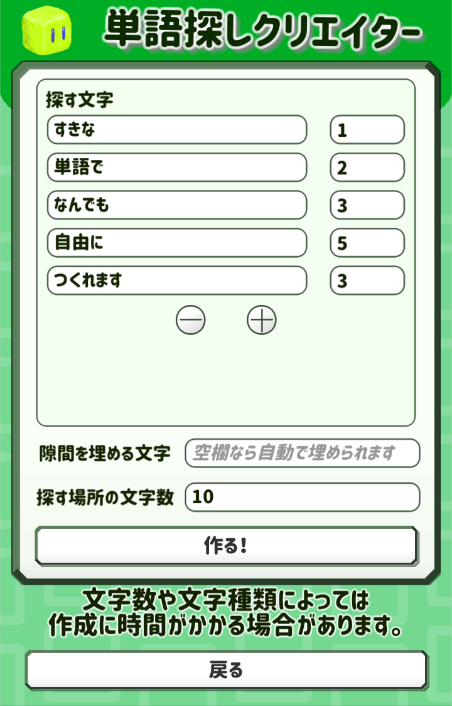 आप अपनी पसंद के अनुसार शब्द खोज सकते हैं! आपके द्वारा की गई समस्या को खोलें और सभी को खेलने दें चलो एक दोस्त को एक कठिन समस्या भेजें!