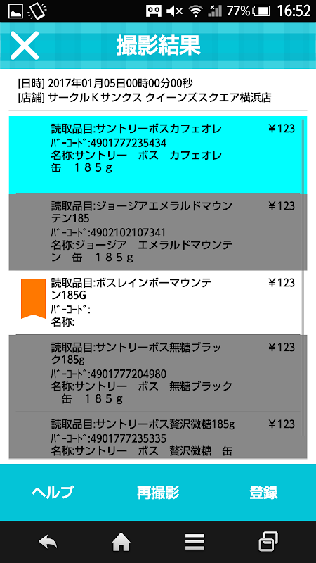 お買いもの登録アプリは、お買い物をした商品のバーコードを読み取り、登録するアプリです。