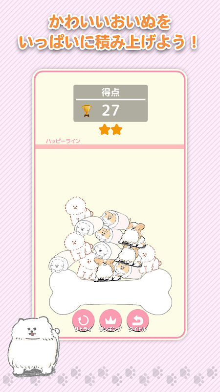 タップしておいぬをどんどん積み上げて得点を競う、とってもライトなゲームです。