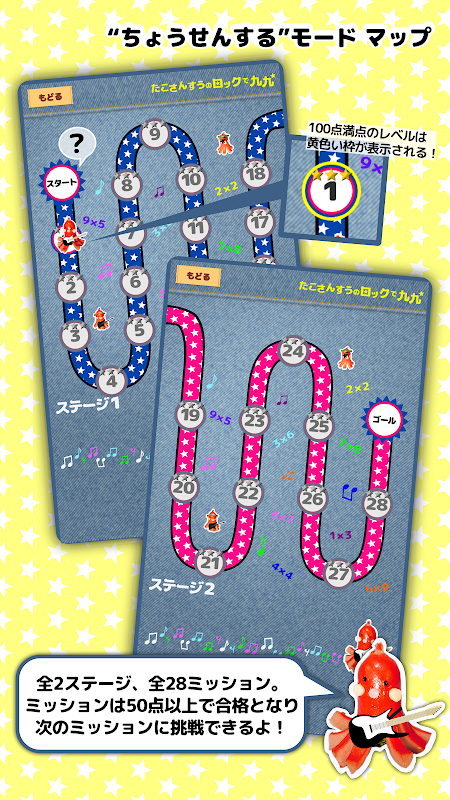 प्रत्येक मिशन में, आपको गुणन सारणी में महारत हासिल करने में मदद करने के लिए, हमने एक मिशन तैयार किया है जो प्रत्येक स्तर के लिए क्रम से 9 प्रश्न पूछता है, एक मिशन जो प्रत्येक स्तर के लिए यादृच्छिक रूप से 9 प्रश्न पूछता है, और एक मिशन जो यादृच्छिक रूप से 10 प्रश्न पूछता है किसी भी स्तर ने किया।