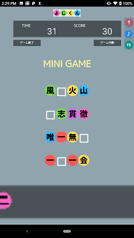 मुख्य गेम की समीक्षा करने के लिए प्रत्येक स्तर के बीच मिनी-गेम हैं। बार-बार बजने से चार अक्षर के मुहावरों का ज्ञान और गहरा हो जाएगा।