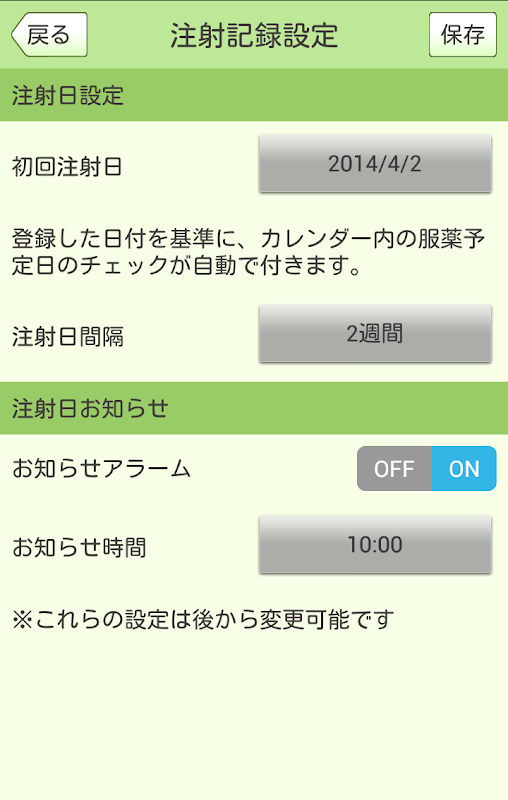 メインのカレンダー画面では、注射予定日、体調記録、通院予定日がアイコンで表示されるので一目でわかるようになっています。Q&Aでは注射に関するよくある質問を閲覧することができます。