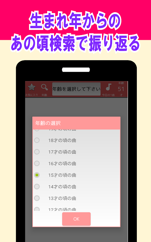 ・虫眼鏡ボタンを選択すると、年→アーティスト→キーワード順に