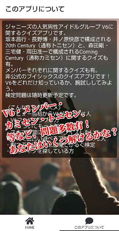 यह जॉनी के लोकप्रिय पुरुष मूर्ति समूह V6 के बारे में एक प्रश्नोत्तरी ऐप है। कई क्विज़ हैं जिन्हें प्रशंसकों को अवश्य देखना चाहिए। आप कितनी समस्याओं का समाधान कर सकते हैं?