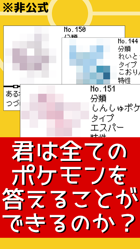 ポケットモンスターに登場するポケモンに関するヒントから名前を答える無料クイズゲームアプリ【非公認非公式】ポケモンgoに登場するあのキャラたちも出題されるよ