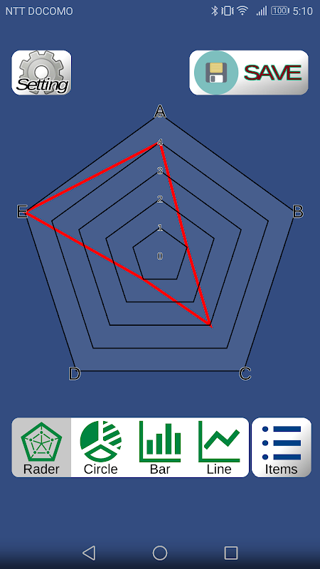 簡単操作でレーダーチャート、円グラフ、棒グラフ、折れ線グラフを作れます。 色の変更や表示のオンオフが設定可能で作ったグラフは画像として保存できます。