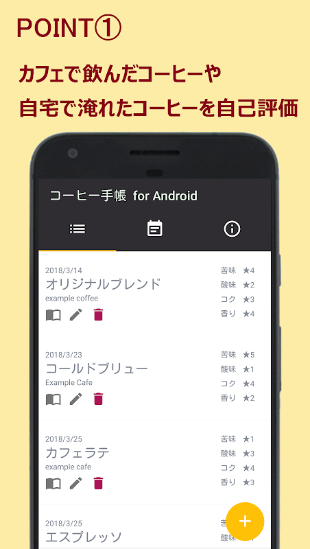 カフェで飲んだコーヒーや自宅で淹れたコーヒーの名前、産地、味などを手軽に記入して、いつでも見ることができます。また、味の評価は苦味、酸味、コク、香りのそれぞれ4つを5段階で決めることができるので、コーヒーの味を忘れることもありません。