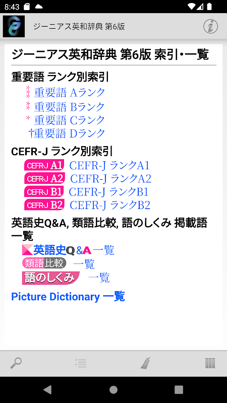 - एक सूचकांक जो ए से डी तक रैंक के आधार पर महत्वपूर्ण शब्दों को व्यवस्थित करता है, "सीईएफआर-जे (रैंक ए 1 से बी 2)" के रैंक द्वारा एक सूचकांक जो किताबों में नहीं पाया जाता है, अंग्रेजी इतिहास प्रश्नोत्तर, पर्यायवाची तुलना, और शब्द संरचना और व्याख्या पर कॉलम भी एक सूची में संक्षेपित हैं, और आप वह कॉलम प्रदर्शित कर सकते हैं जिसे आप देखना चाहते हैं।