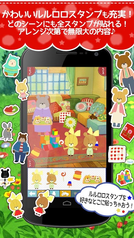 好きなシールを何度も貼り直すことができるシールブックと同じように、ルルロロの可愛いスタンプをあっちこっちに貼って楽しめるアプリです。