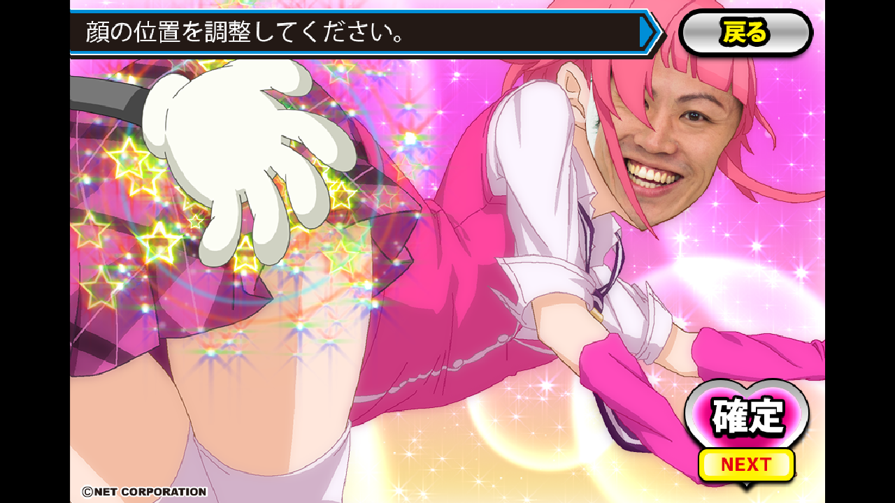 ・位置調整画面では、フレーム中の位置を拡大・縮小・移動・回転できます。位置調整画面に遷移した時点で、撮影した画像が、フレームに収まった状態で表示されていますが、フレーム内にきれいに収まるように位置や大きさを調整してください。確定ボタンで画像が合成されます。