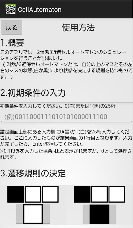 यह सेलुलर ऑटोमेटा के सिमुलेशन प्रदर्शन करने के लिए एक आवेदन पत्र है. प्रारंभिक स्थितियों, यह दोनों संक्रमण नियमों में स्वतंत्र रूप से सेट किया जा सकता है!