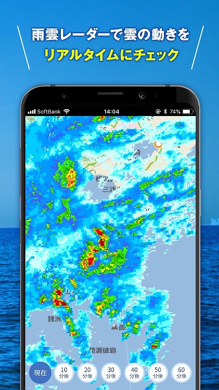 आप बारिश के बादल रडार के साथ वास्तविक समय में बादलों की आवाजाही की जाँच कर सकते हैं। आप हर 10 मिनट में 60 मिनट आगे तक बारिश के बादलों की आवाजाही की जाँच कर सकते हैं। आप ऐप में अपने वर्तमान स्थान और मछली पकड़ने के स्थान पर बारिश के बादलों की स्थिति आसानी से देख सकते हैं, इसलिए आप उस समय को नहीं चूकेंगे जब मछली पकड़ना आसान होता है, जैसे कि हल्की बारिश के बाद।