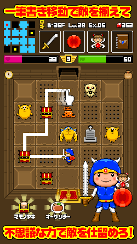 移動、攻撃、アイテム取得は全て画面上のマスをタップして行えます。
