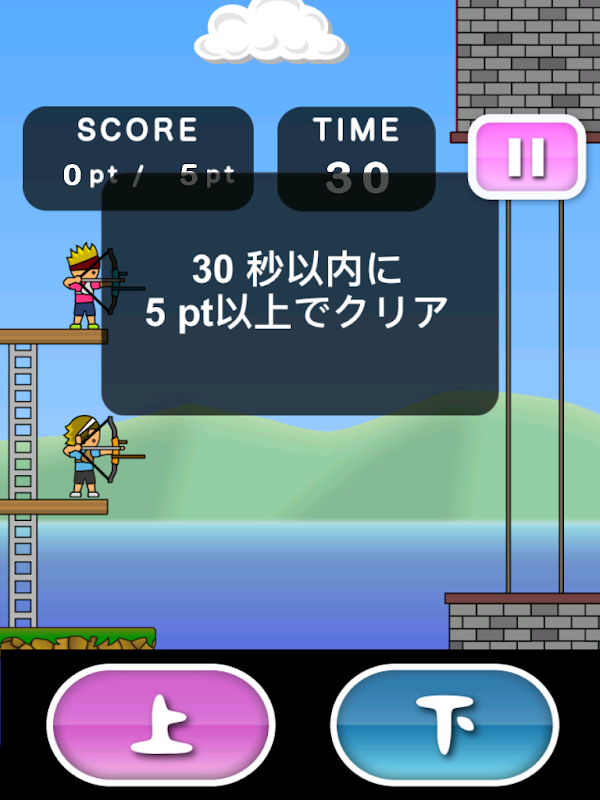 2人のプレイヤーを操作して上下に移動する的に矢を当てるゲームです。