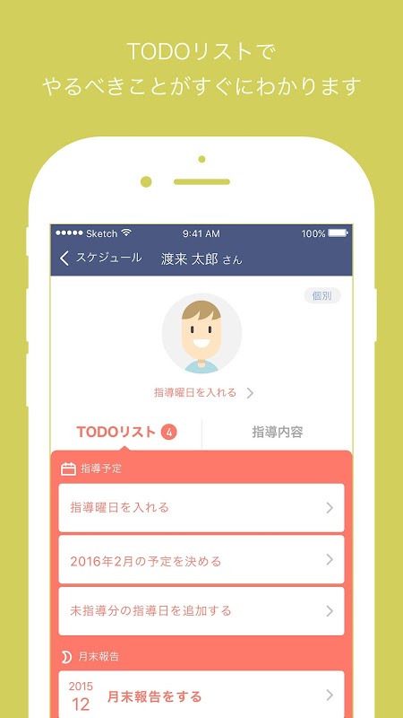 - プッシュ通知機能で、指導日や日次指導報告のウッカリ忘れを防ぎます。