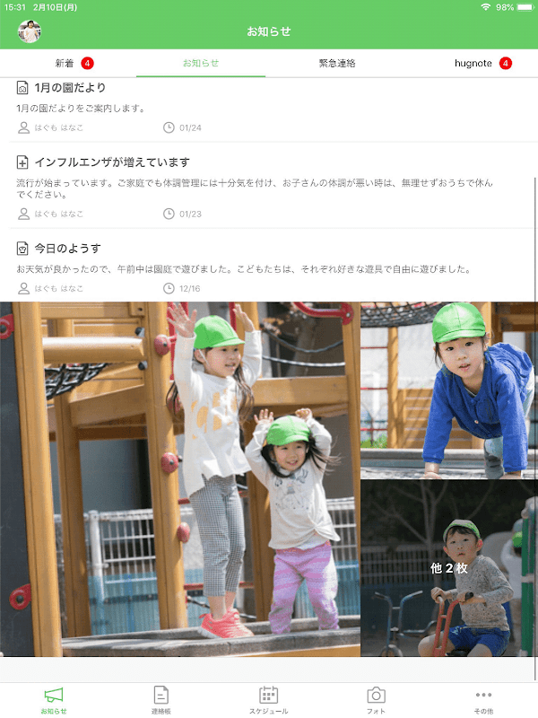 Hagunoto (hugnote) एक संचार आवेदन बगीचे और घर जोड़ता है। देखभाल करने वालों के व्यवसाय दक्षता, जाहिर है, यह माता-पिता के साथ संपर्क करने के लिए आसान बनाता है।