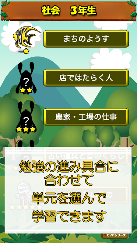 小学校3年生の社会アプリの決定版!学習の進み具合に合わせて単元を選択して、効率的に復習できます。4択のクイズ形式という使いやすさ、勉強のご褒美にモンスターを集めていく楽しさで、子供が継続的に勉強します。