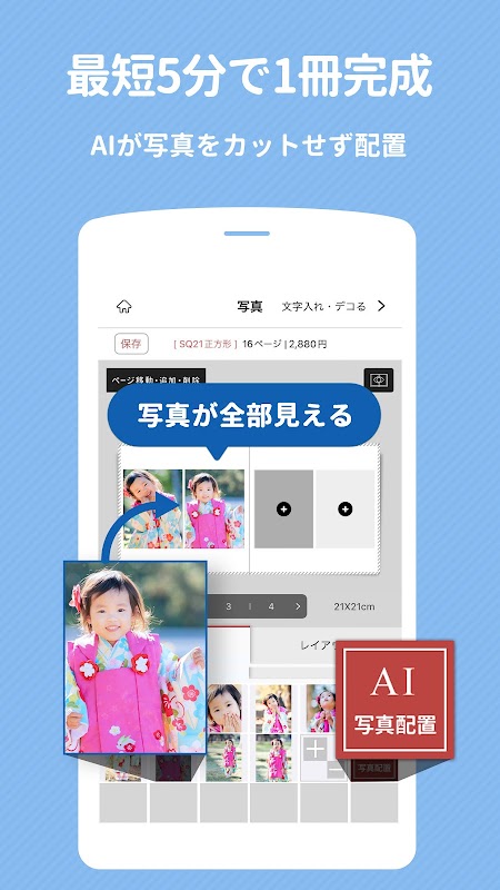 अगर आपको यह तय करने में परेशानी हो रही है कि कौन सी तस्वीरें किस पेज पर लगानी हैं और संपादन सुचारू रूप से नहीं हो रहा है, तो AI आपकी मदद करेगा। चुनी गई तस्वीरें स्वचालित रूप से कालानुक्रमिक क्रम में व्यवस्थित हो जाती हैं, जिससे आप आसानी से और तेज़ी से एक आकर्षक फ़ोटो एल्बम बना सकते हैं।