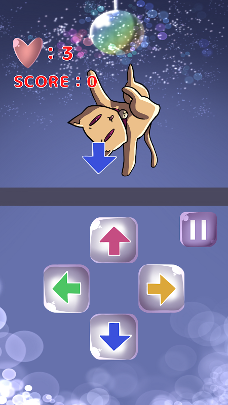 जब खिलाड़ी स्क्रीन के नीचे ``ऊपर, नीचे, बाएँ और दाएँ बटन'' का उपयोग करके ऊपर से बेतरतीब ढंग से गिरने वाले तीरों को टैप करता है, जब वे काली रेखा को ओवरलैप करते हैं, तो बिल्ली नृत्य करेगी।