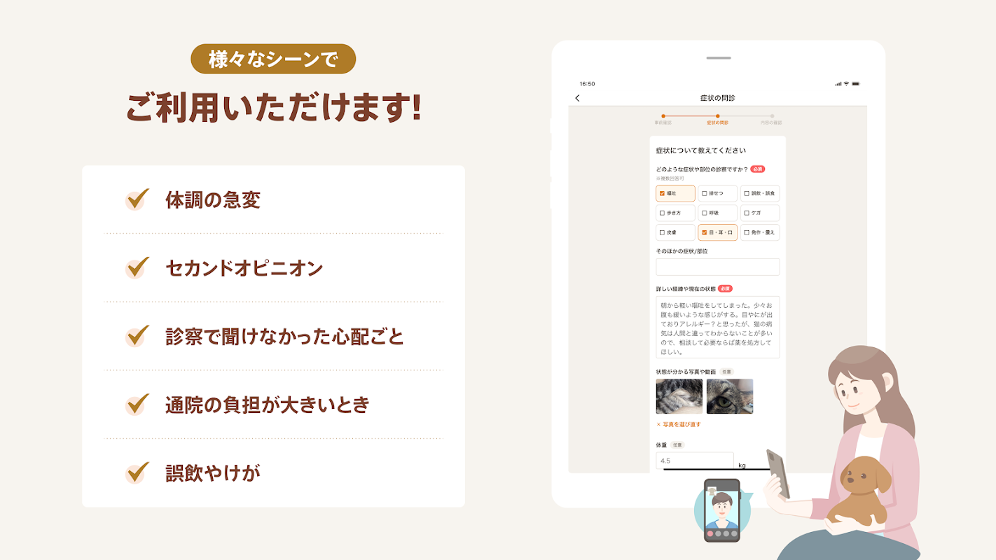पशु चिकित्सक ऐप का उपयोग करके वीडियो कॉल के माध्यम से आपके पालतू जानवर की स्थिति की जांच करेंगे और उसकी जांच करेंगे।