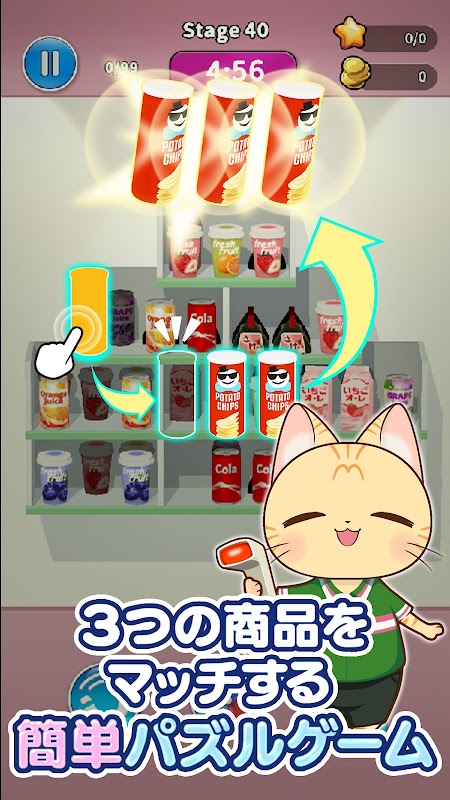 यह ``कन्वीनियंस स्टोर'' नामक जापानी स्टोर में सेट की गई एक 3डी उत्पाद सॉर्टिंग पहेली है, जहां आपको अलमारियों पर बिखरी हुई 3 समान वस्तुओं को इकट्ठा करना है और उन्हें दूर रखना है।