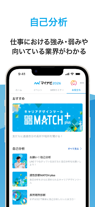 यह छात्रों के लिए "रोजगार" ऐप का 2026 संस्करण है, जिसमें कंपनी की जानकारी के साथ-साथ स्व-विश्लेषण उपकरण, योग्यता परीक्षण और वेब परीक्षण तैयारी जैसी विभिन्न उपयोगी सामग्री शामिल है!