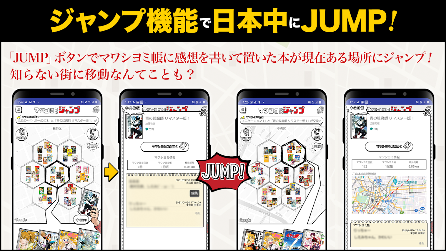 आप एमएपी पर फैले जम्प मंगा को उठा सकते हैं और पढ़ सकते हैं! पढ़ने के बाद मावाशियोमी किताब में अपने विचार सबके साथ साझा करें! नए मंगा का सामना करने का आनंद लें!
