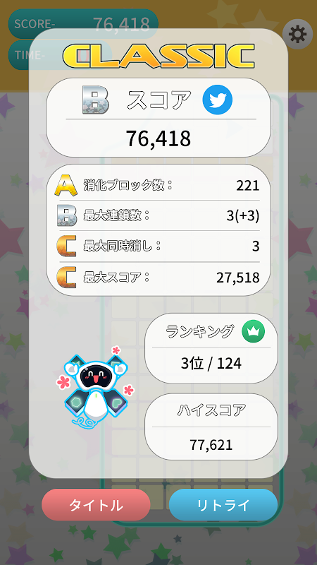 खेल समाप्त होता है जब समय सीमा समाप्त हो जाती है या ब्लॉक शीर्ष गेम ओवरलाइन तक ढेर हो जाते हैं।