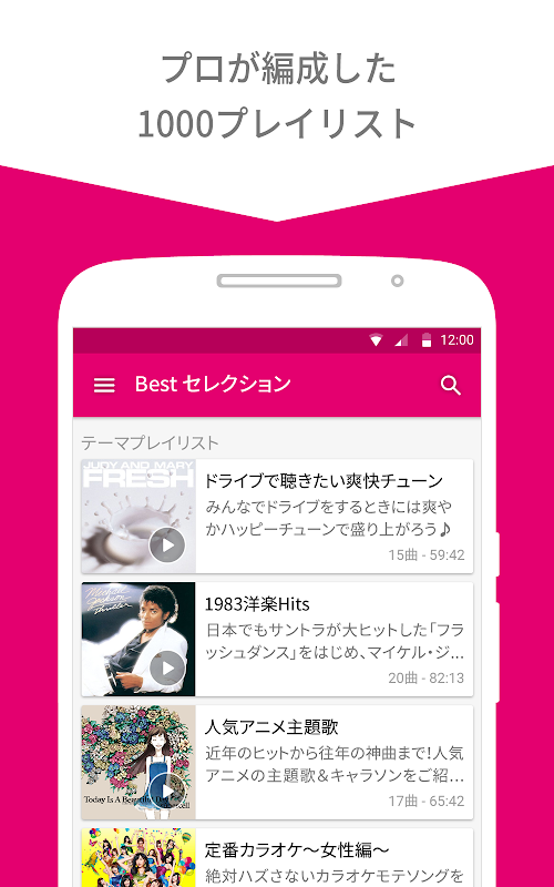 レコチョクBestでは旬のテーマに合わせた音楽や話題の歌手・アイドルから厳選オリジナルプレイリストを1,500以上ご用意。最新の曲、最新ヒットチャート、カラオケソングもここさえ押さえておけば何を聞くか迷うこともありません!