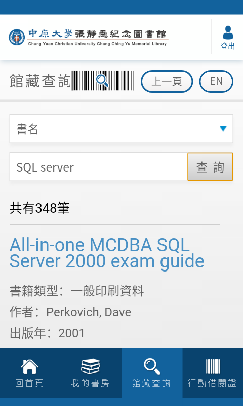 1. 館藏查詢:使用書名、作者關鍵字或國際標準書號 (ISBN) 查詢館藏,並可利用上方的ISBN掃描功能讀取ISBN條碼查詢館藏。